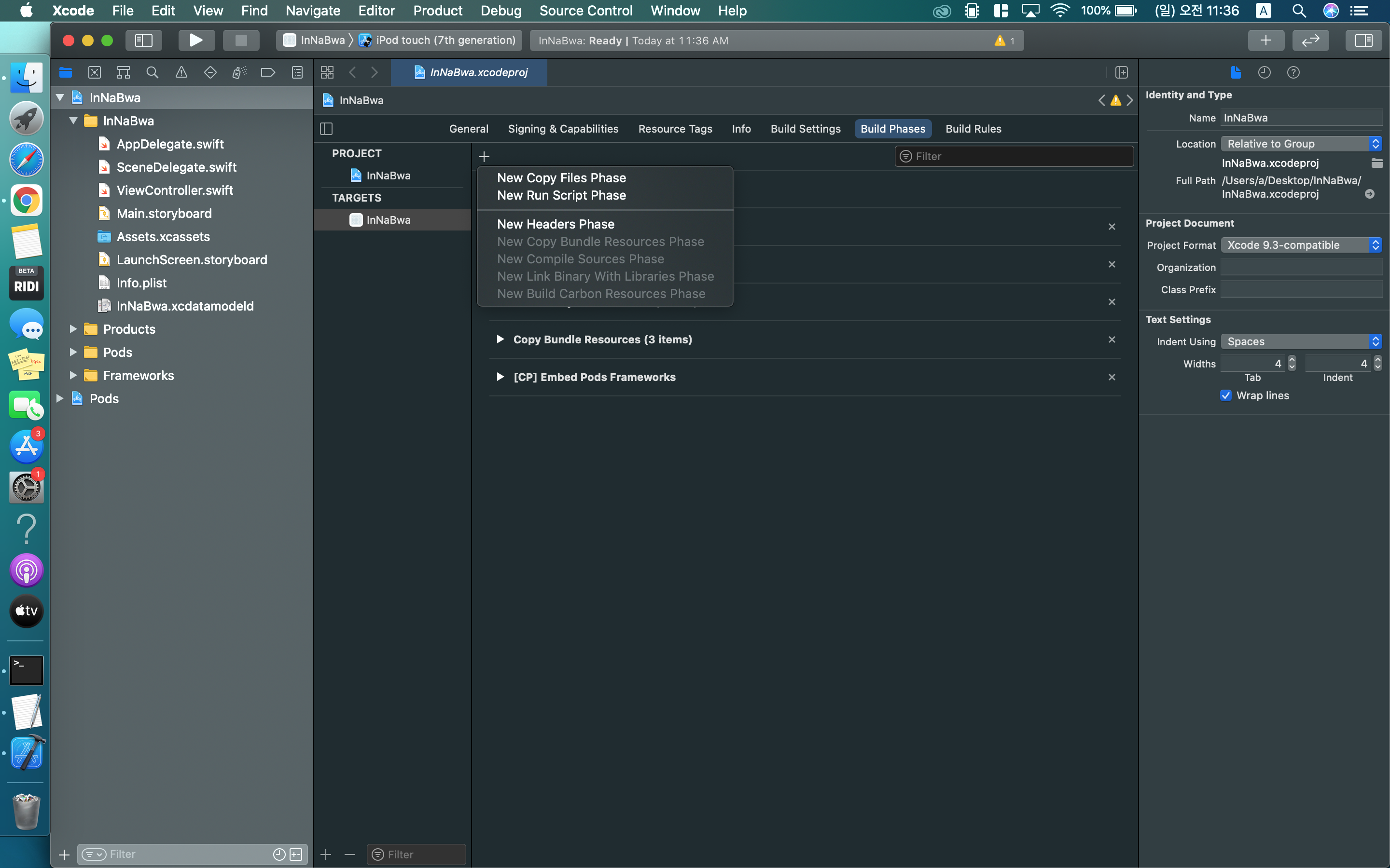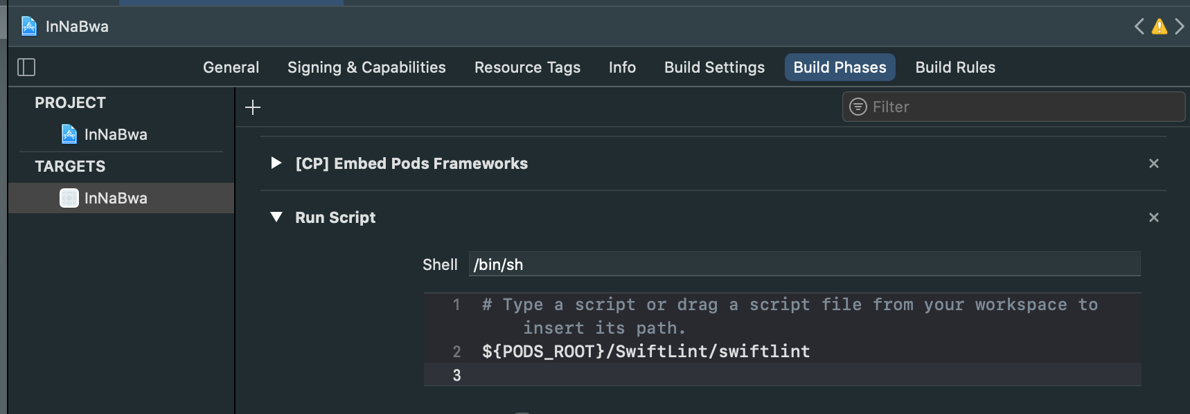 Project 설정에서 Build Phases 에 들어가도록하자.