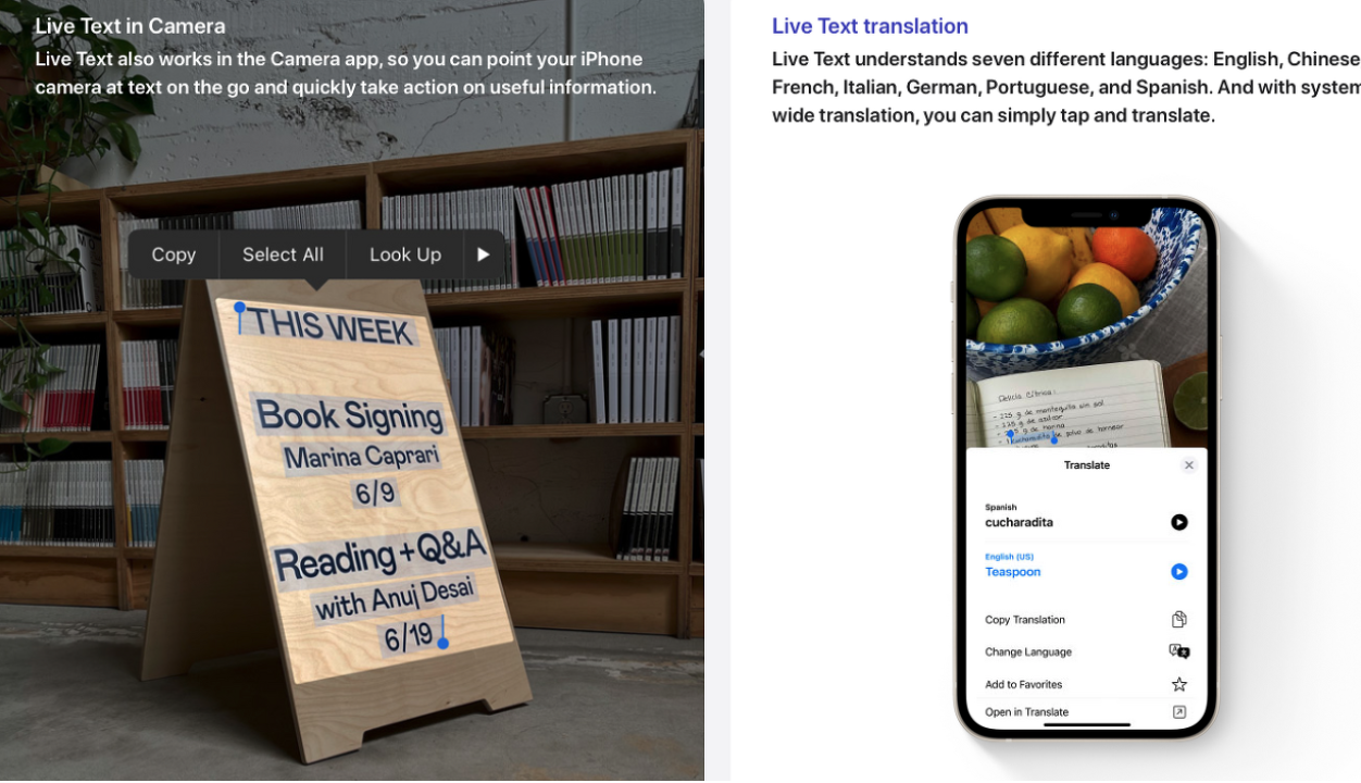 사진에서 정보를 인식하는 기술로 OCR(Optical Character recognition, 광학 문자 인식) 기술이 진보되어 사진 속 문자 정보를 복사 한다거나 상호명을 검색해 직접 전화를 걸 수도 있다.