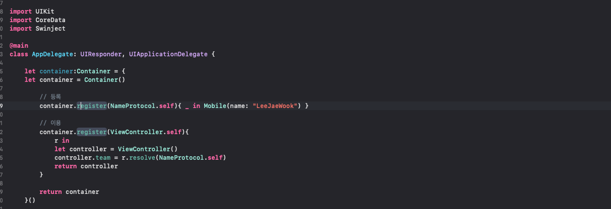앞에서 사용했던 nameProtocol을 컨테이너를 이용해서 외부 주입된 name을 사용해보도록 하겠다.