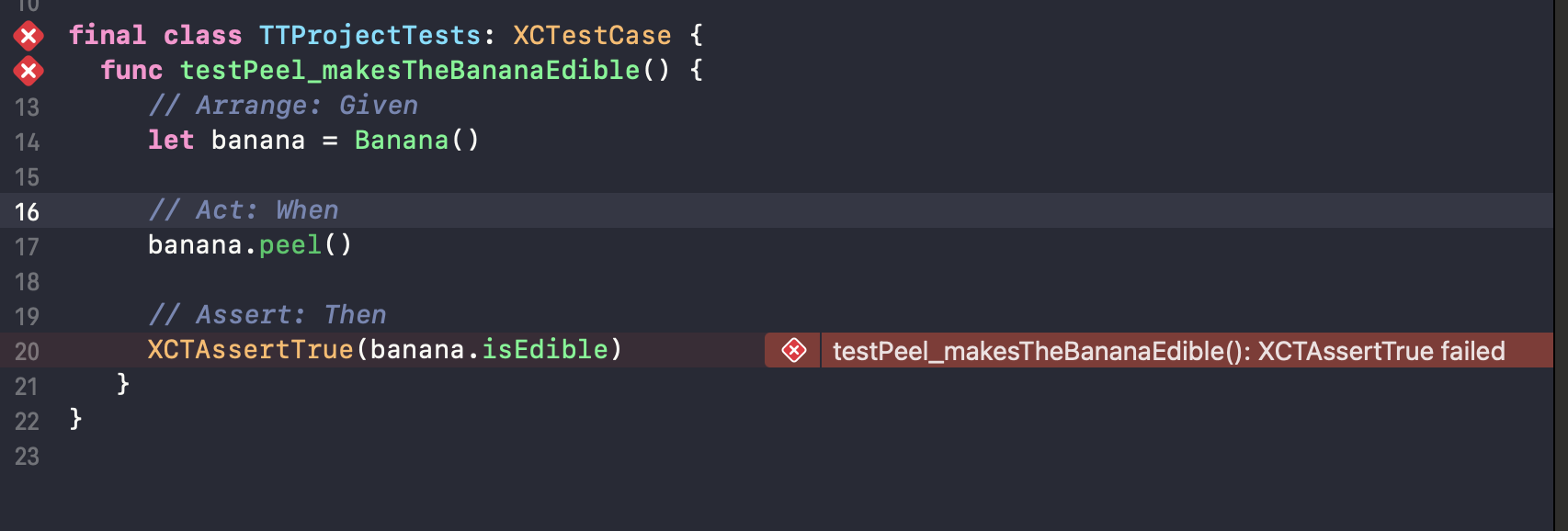XCTest 로 개발한 테스트 케이스가 실패 할 경우 어떻게 나타날까요?