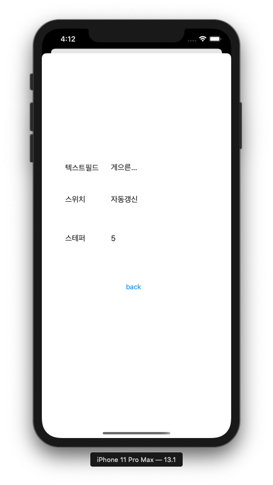 위에서 부터 텍스트 필드, 스위치, 스테퍼, 버튼이다.